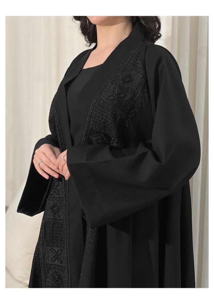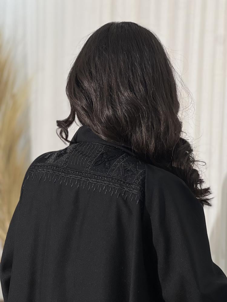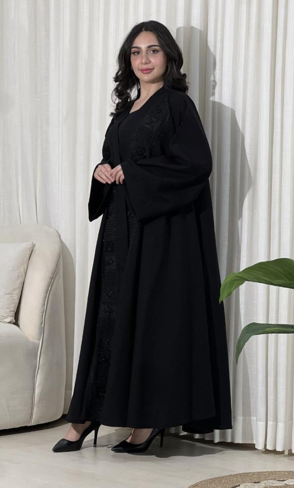 - تصميم العباية: مطرزة بشك بلون أسود على طول العباية.